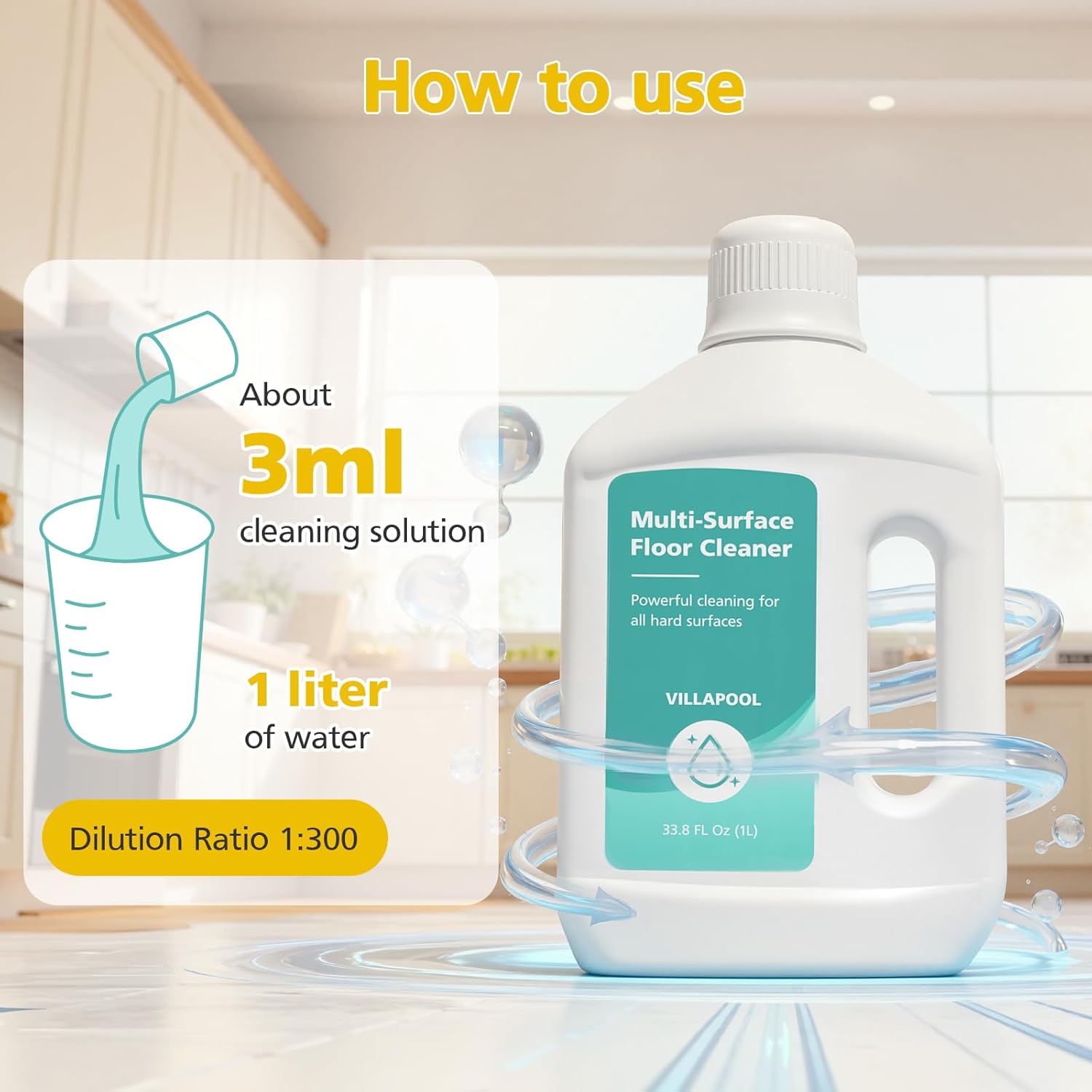 【EASY TO USE】Dilute the floor cleaner at a 1:300 ratio (1 part solution to 300 parts water) for best performance. Do not mix with other detergents. Store in a cool, dry place and keep sealed when not in use.