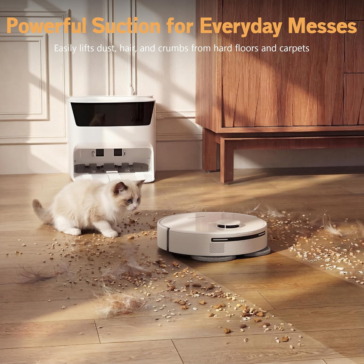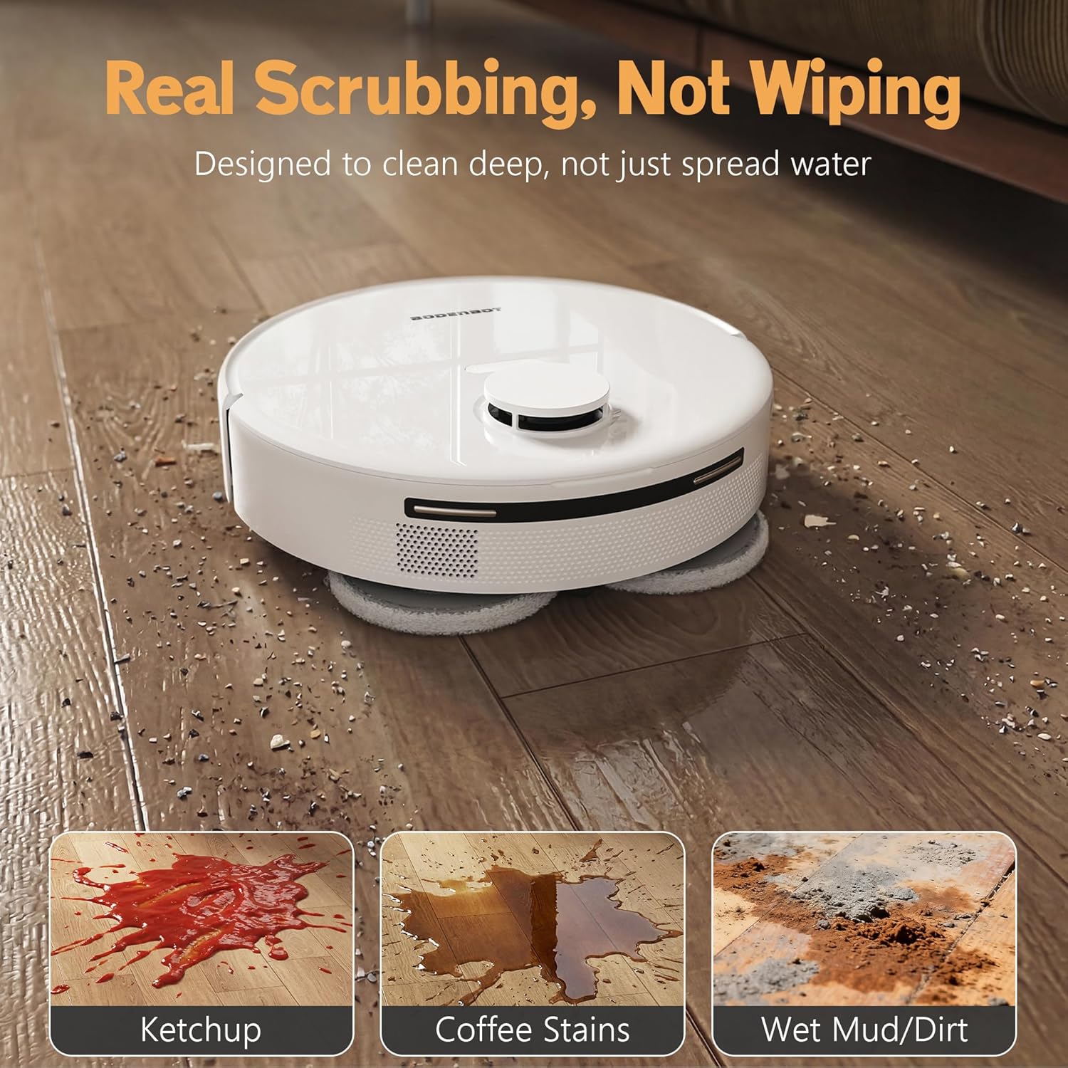 【𝐑𝐞𝐚𝐥 𝐒𝐜𝐫𝐮𝐛𝐛𝐢𝐧𝐠 𝐰𝐢𝐭𝐡 𝐃𝐮𝐚𝐥 𝐒𝐩𝐢𝐧𝐧𝐢𝐧𝐠 𝐌𝐨𝐩𝐬】- Dual spinning mop pads actively scrub wood, tile, and hard floors, lifting dried stains and everyday messes more effectively than basic wipe-style robot mopping.