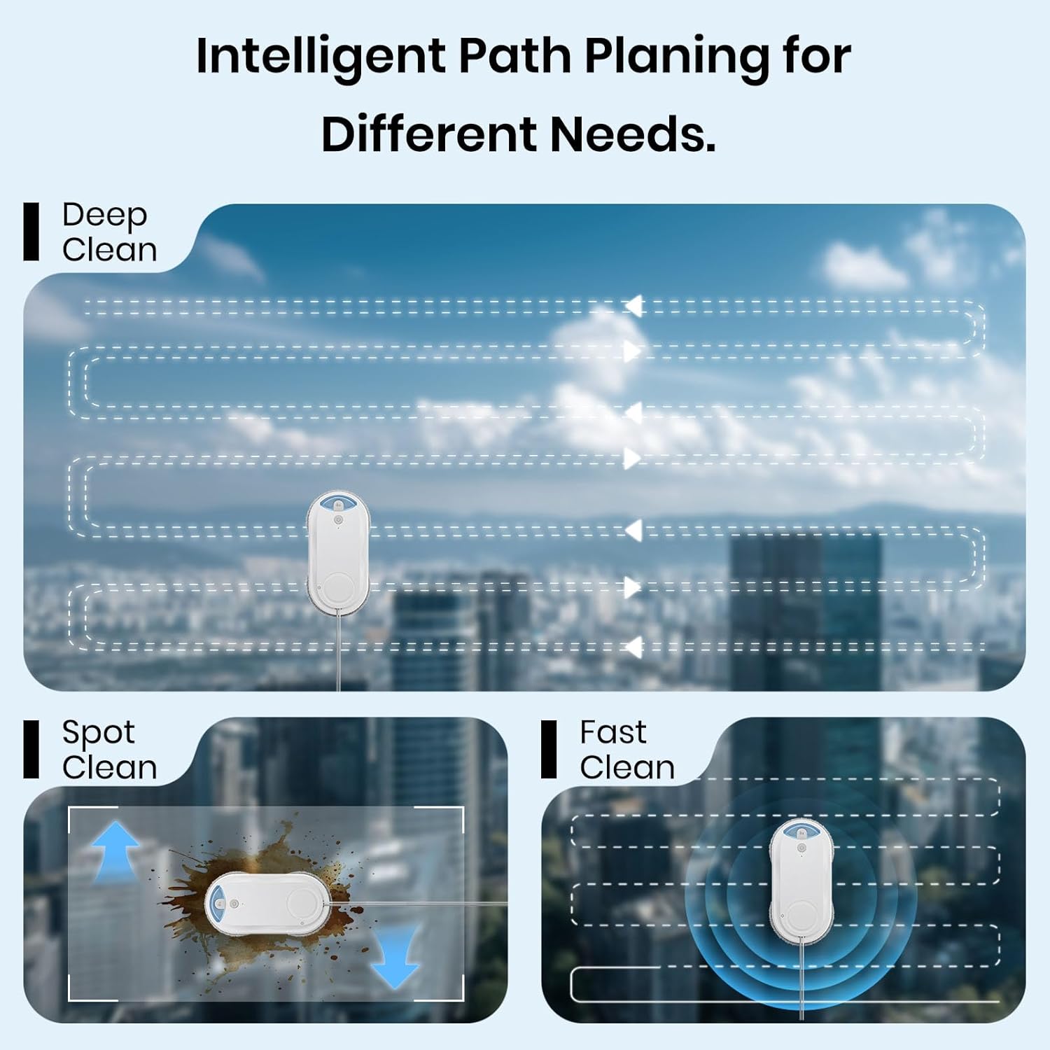Smart cleaning with AI Path Planning: Smart window cleaning robot offers various cleaning paths and modes. Plug in the power cord and turn on the switch,It automatically recognizes its position, scans the frame and offers the option to choose between manual and automatic modes.