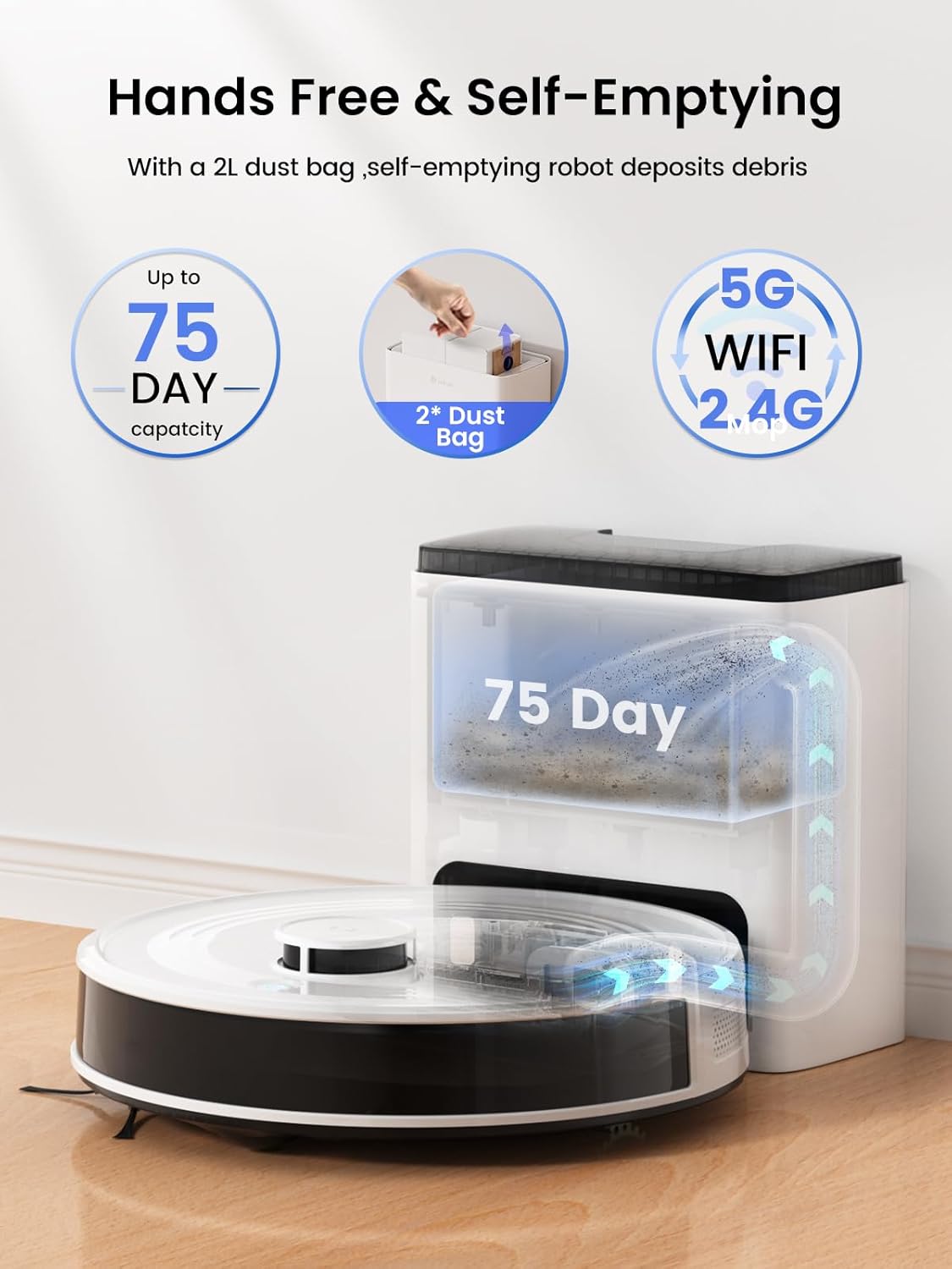 👍【Dual-Band WiFi Robot Vacuum (2.4G/5G) 】– Connect to one of the WiFi ensures stable connectivity for uninterrupted cleaning. 2.4G covers whole home, while 5G delivers high-speed control. No more dropouts! The system continuously monitors network conditions, optimizing performance in real-time to avoid interference and congestion. Perfect for busy households with multiple devices, it delivers reliable whole-home coverage while maintaining peak speeds where you need them most.
