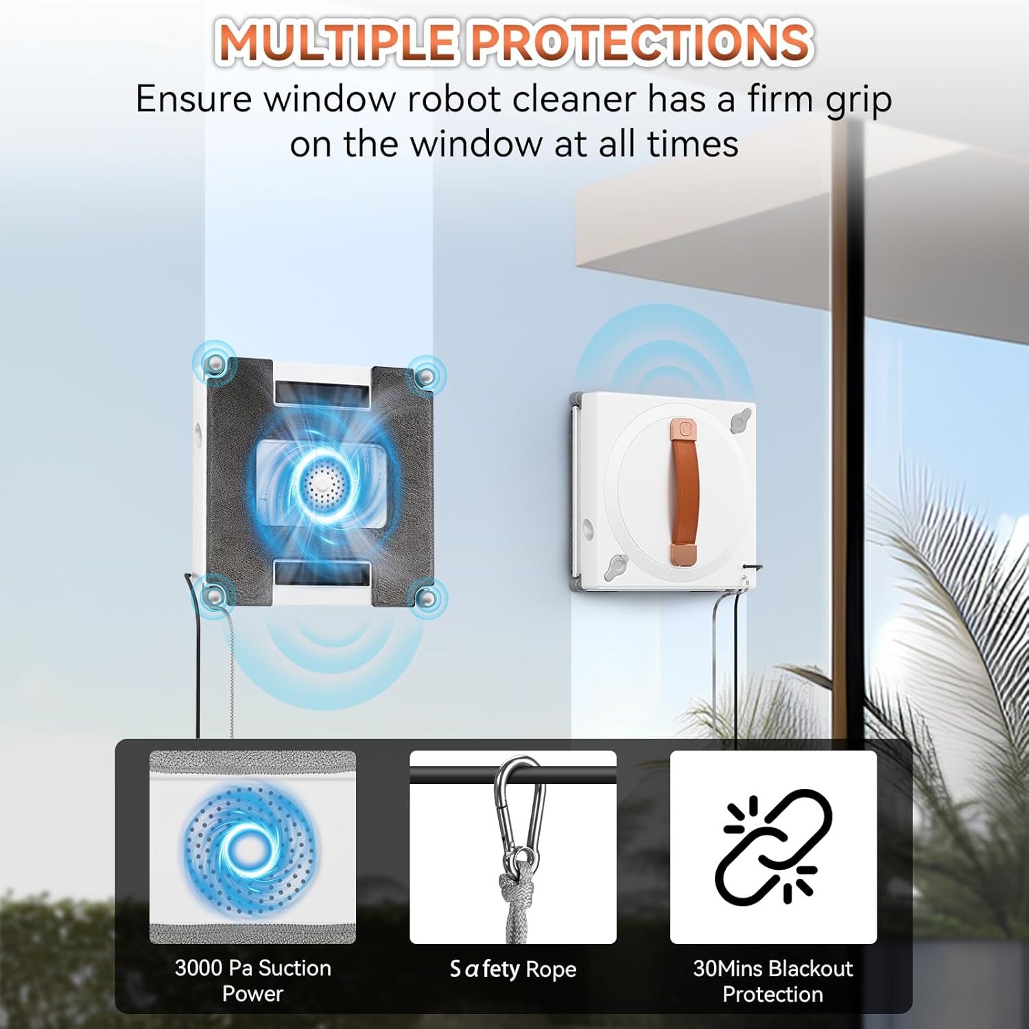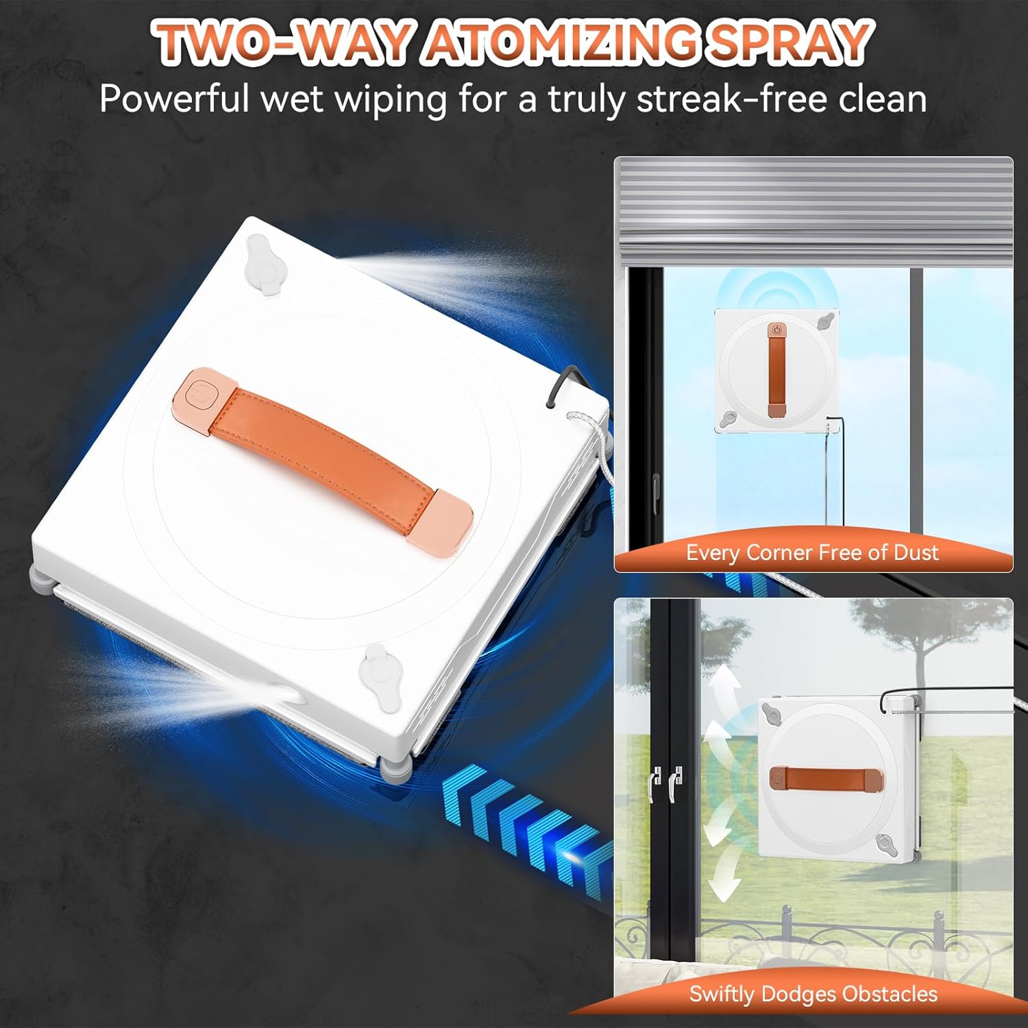 ⏩EASY CLEANING – The window cleaning robot comes with 3000Pa suction pоwer, dual nozzles with ultrasonic spray & 60ml tank, 30-minute pоwer-off sαfeguard, which is strong, allowing you to wipe the windows without effort, saving your hands and time, and avoiding the risks of standing and working at height.