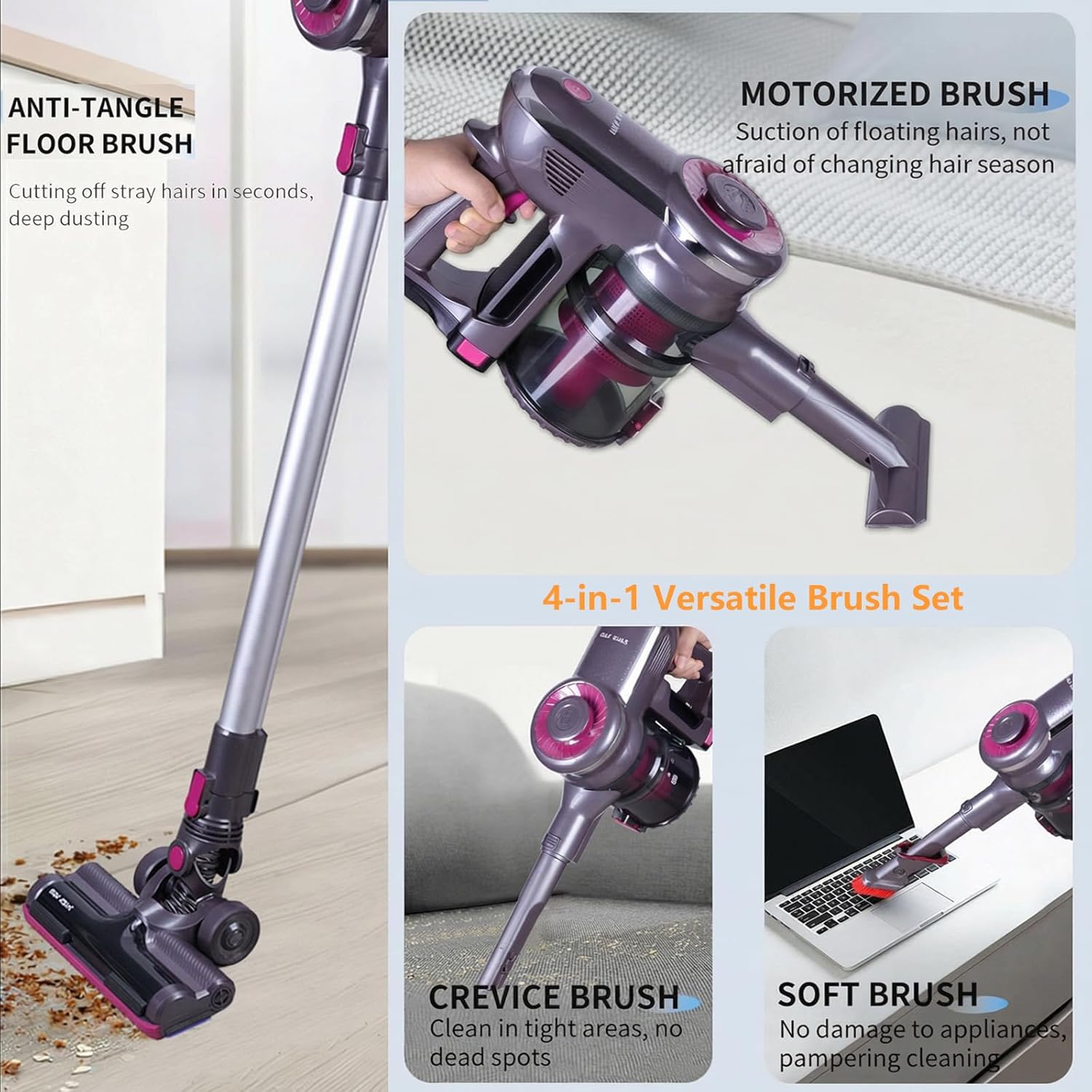 ✨ 4-IN-1 COMPLETE CLEANING SYSTEM – Master every cleaning challenge with specialized tools: anti-tangle floor nozzle brush for hard floors, powerful T-shape vortex brush for deep carpet cleaning, flexible crevice tool for tight spaces, and gentle soft brush for delicate surfaces. One vacuum, unlimited cleaning possibilities