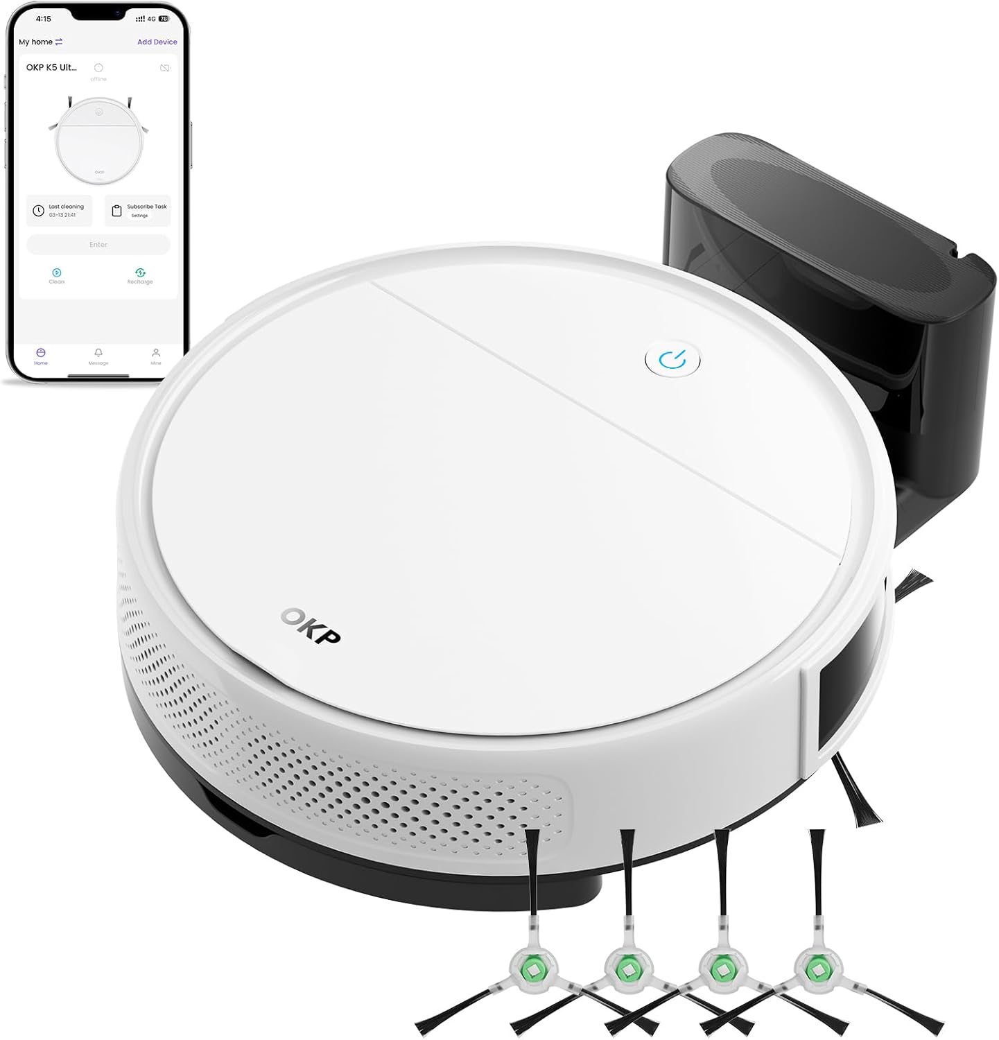 Customisable cleaning Via App & voice control: Use the OKP app to schedule cleanings, select modes (Auto, Spot, Edge, or Schedule), and track cleaning progress. The OKP K5 Ultra robot vacuum and mop combo compatible with Alexa and Google Assistant, this voice-controlled robot vacuum makes daily cleaning effortless—even when you’re not home.(⚠️Note: Supports 2.4GHz Wi-Fi only)