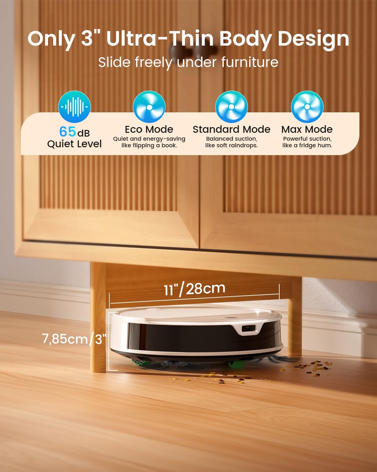 Sweep, Vacuum & Mop: K5 Ultra robot vacuum is a powerful vacuum and mop combo, equipped with a tangle-free suction port, 500ml large-capacity dustbin, and magnetic mop holder with disposable mop pads. It’s designed to handle pet hair, dust, and spills across carpets, hardwood, tile, and laminate floors with ease.