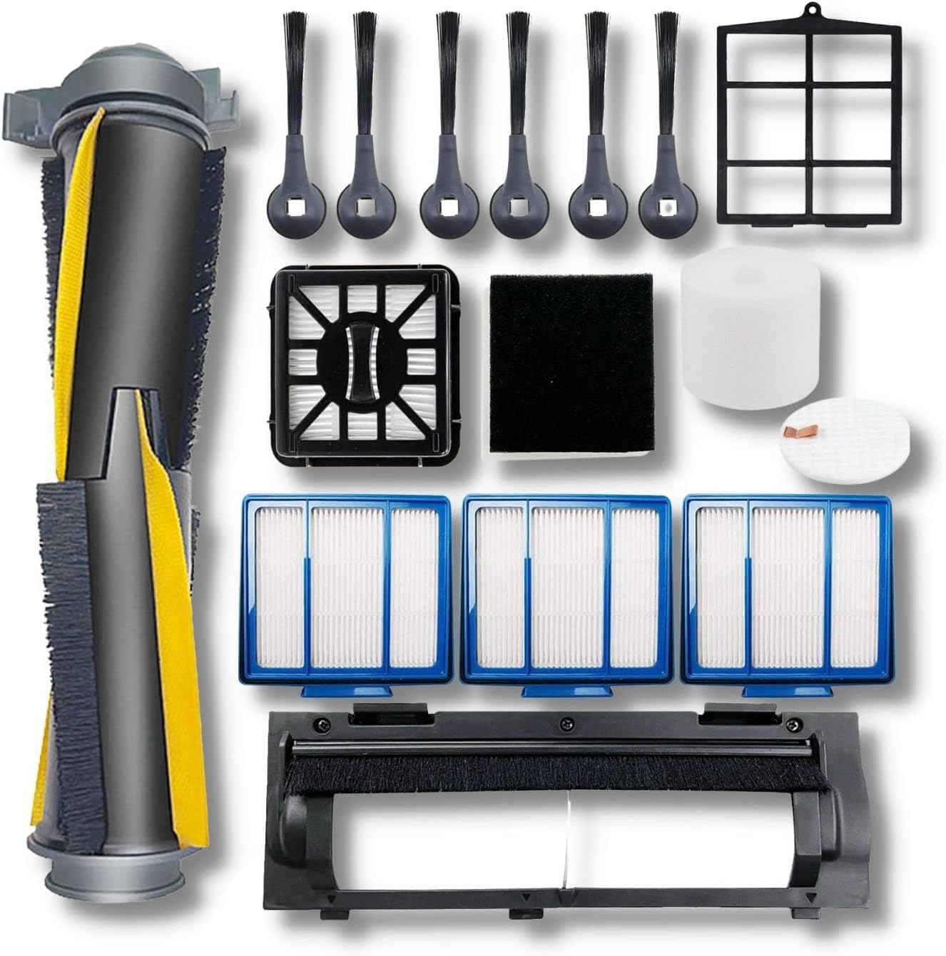 What’s in the package:Self-Clean Roller Brush X1,Roller Brush Cover X1 ,HEPA Filter x3 ,Side/Sweep Brush x6 ,HEPA Filter +Foam Sponge for Clean Base X1 ,Primary Filter X1