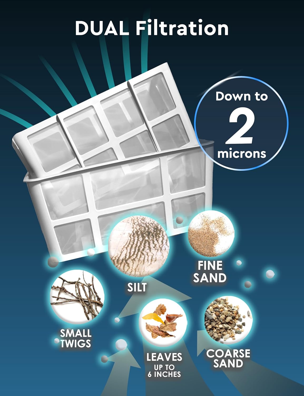 [DUAL LAYER FILTRATION] – Designed for sparkling water. Dual filters design catch debris down to 2 microns (i.e. very fine sand and silt). Top Loading filter design assures easy operations and installation.