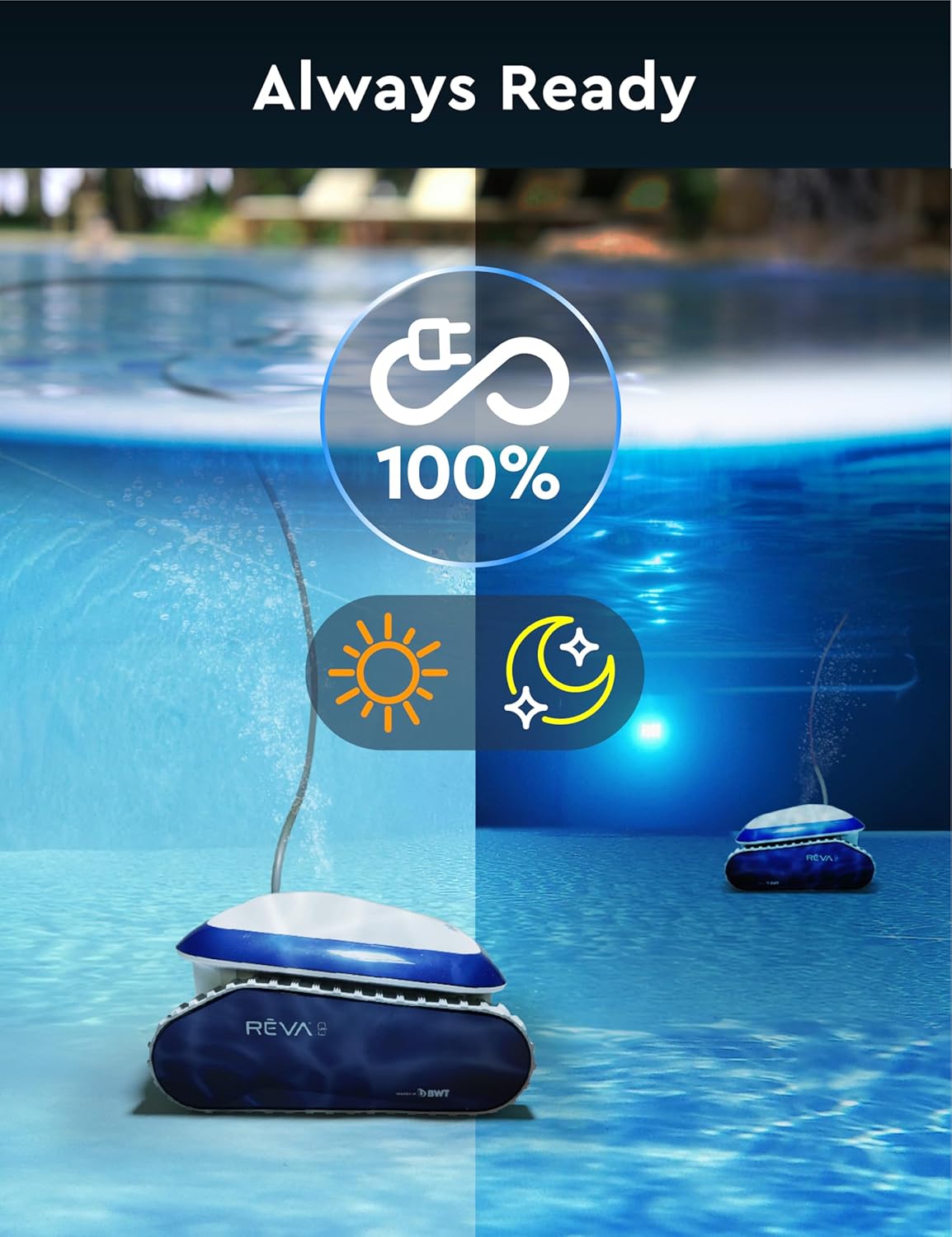 [ALWAYS READY] – Always connected to power, REVA generates 4,000GPH water filtration close to commercial power (around 50% higher than rechargeable cleaners), always ready to perform scheduled regular cleaning cycles. NO power loss, NO recharging, NO battery safety concerns.