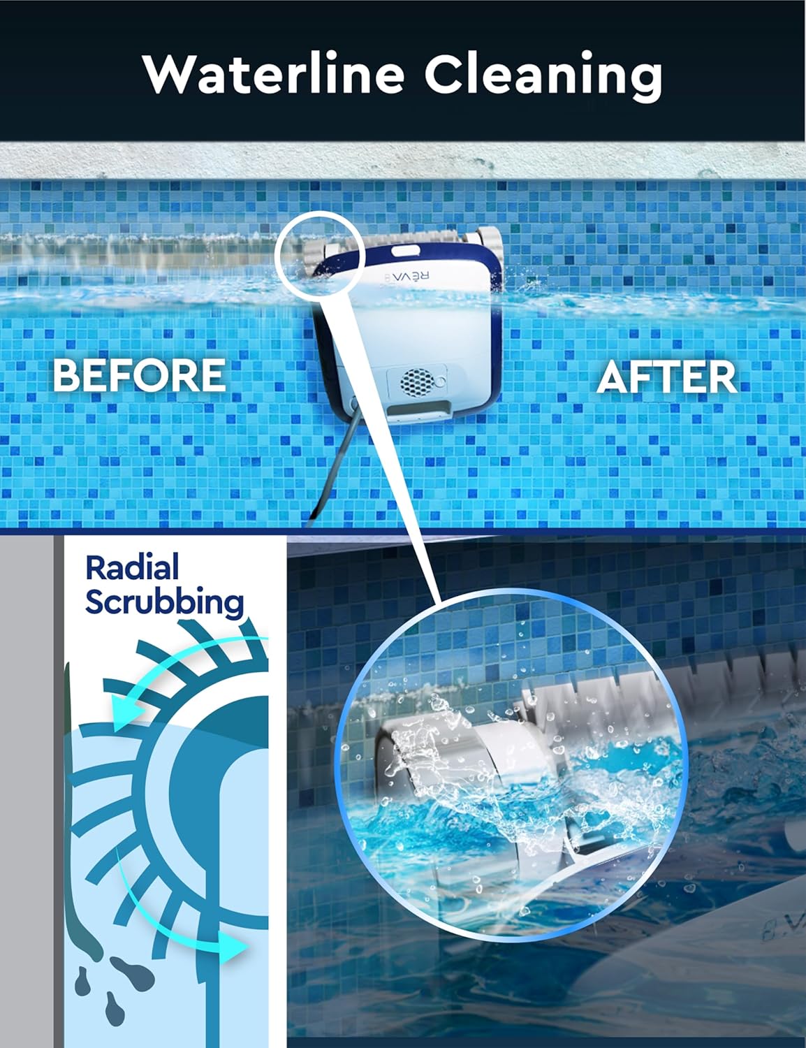 [HORIZONTAL WATERLINE CLEANING] – Waterline is probably the most dirty part of any pool, which poses health risks to swimmers. REVA’s horizontal wall-climbing feature with powerful scrubber can keep your waterline clean.