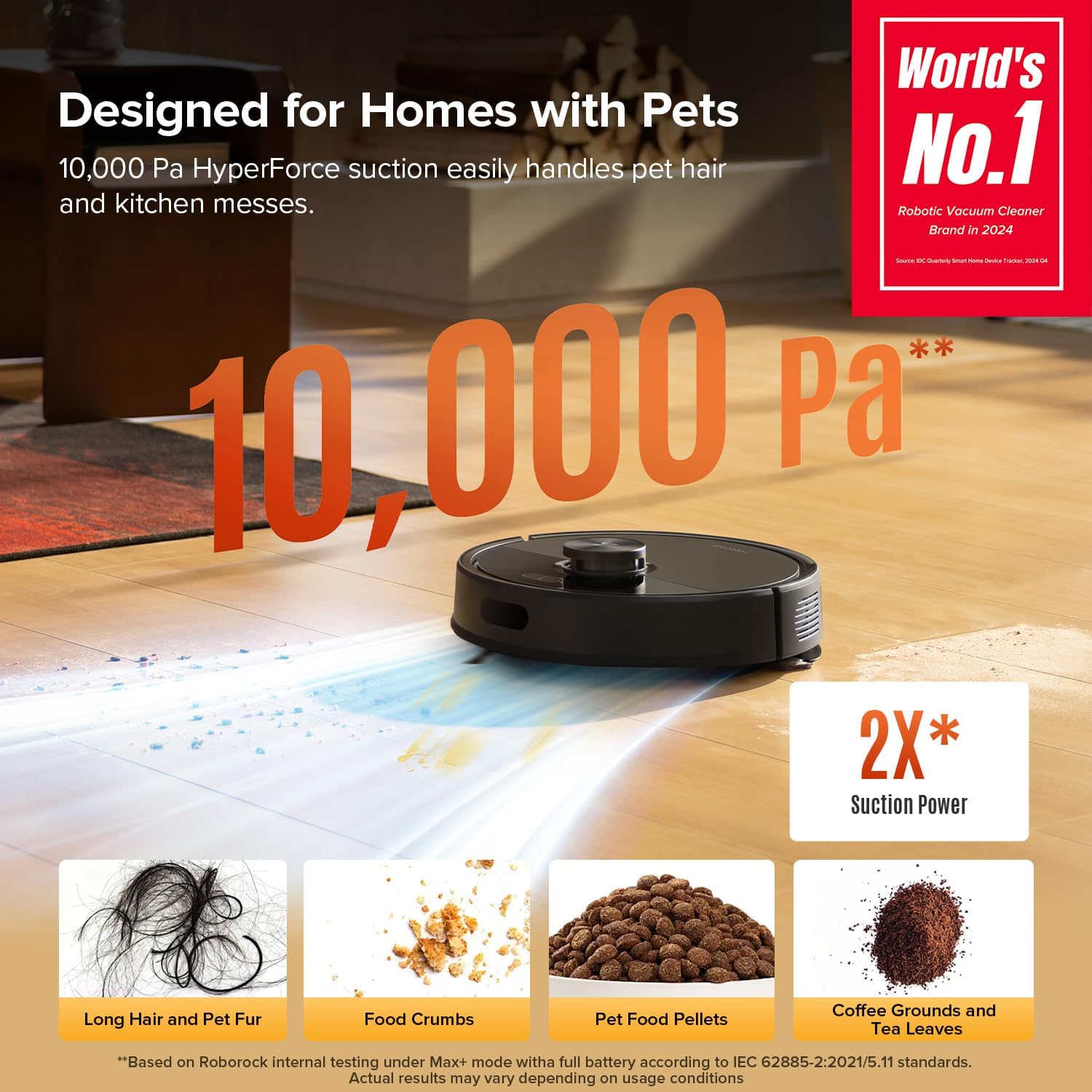 10,000 Pa HyperForce Suction: Effortlessly lifts dust, dirt, pet hair, and debris from carpets, tiles, and hard floors, tackling deeply embedded particles with extreme suction power. You can freely select different vacuuming modes on the app to clean your home.
