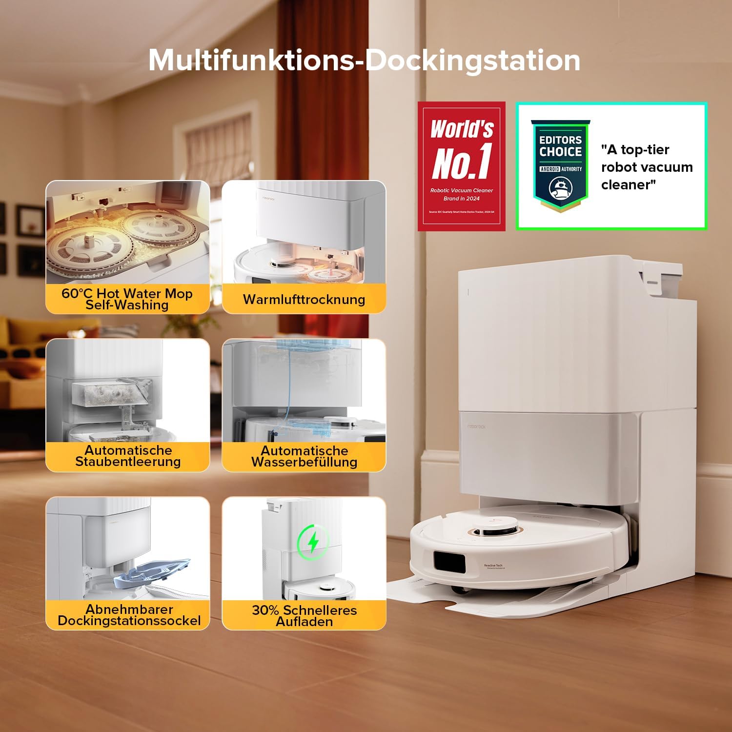 All-in-One Smart Dock with Warm Air Drying – Revolutionize hands-free cleaning: auto-empties dust into a 7-week storage bin, self-washes mops, and uses hot air drying to prevent odor. Auto-refills the water tank for uninterrupted mopping across 3,552 sqft—perfect for large homes.