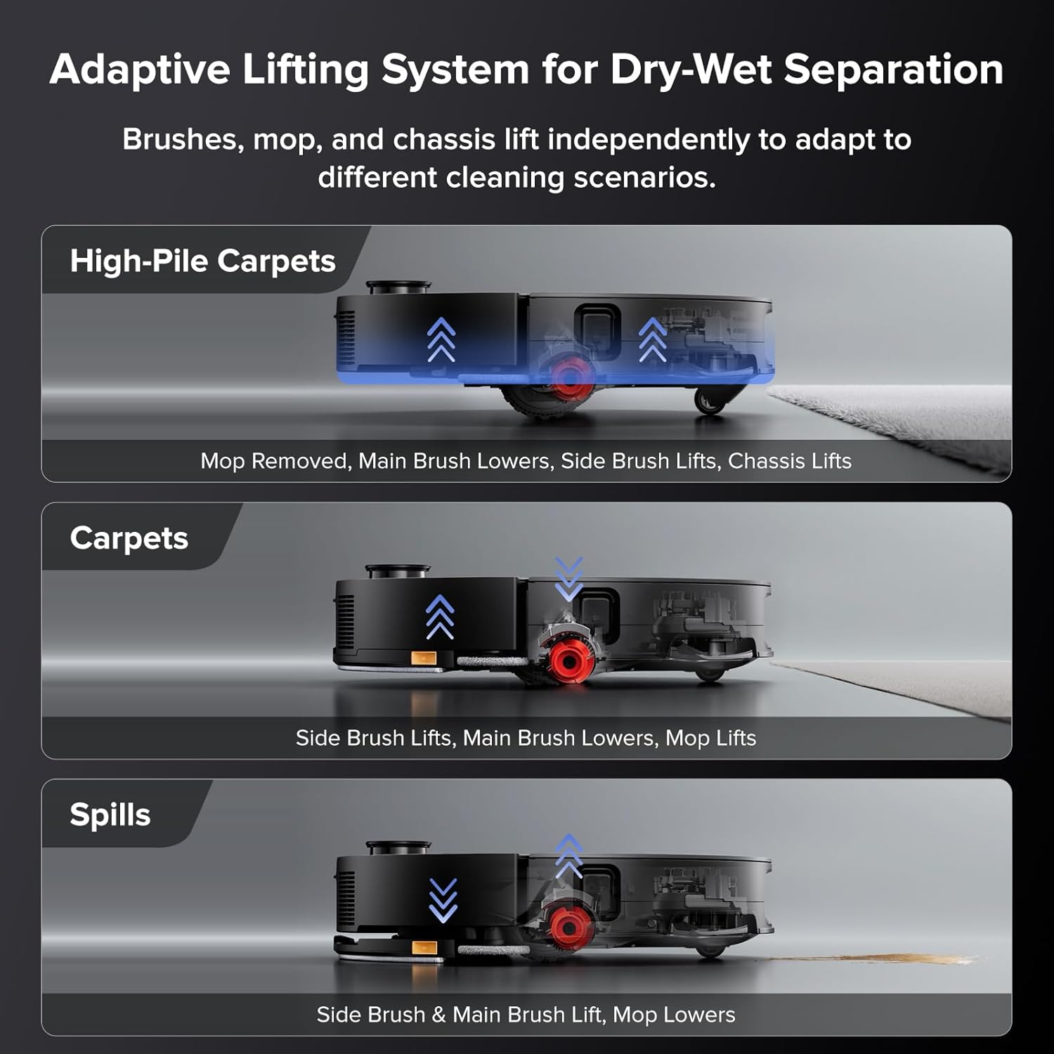 VibraRise 4.0 Self-Detaching Mopping System: Effortlessly switch between vacuuming and mopping with automatic mop disassembly and assembly. Clean carpets without moisture while the 18mm Auto-Lifting Brush and Mop adapts to various surfaces for a thorough, ultimate clean.