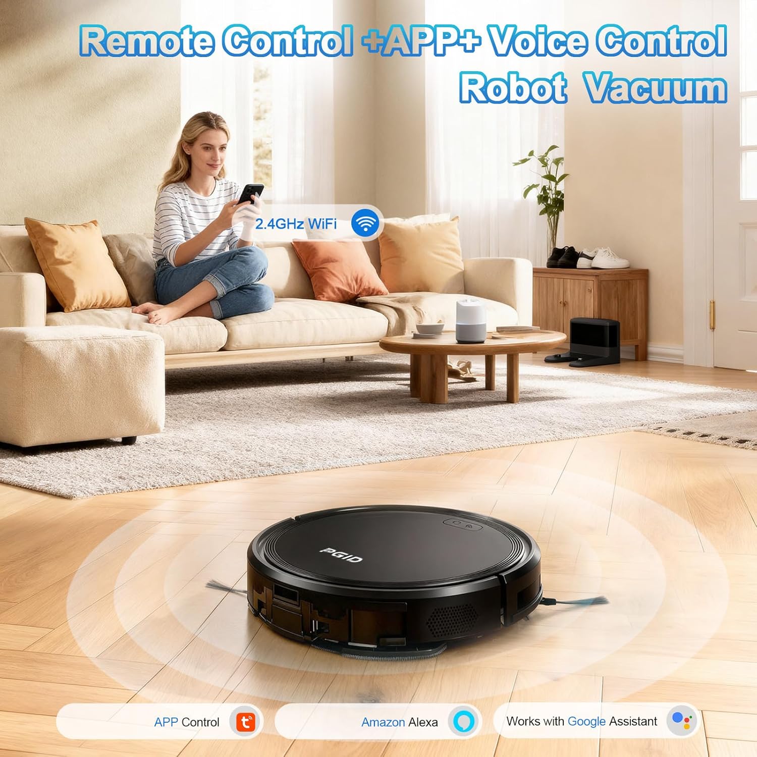 [SMART APP & REMOTE CONTROL] The FGID F5C robot vacuum can be controlled through the remote control and Tuya Smart APP. Many functions such as cleaning direction, mode switching, suction adjustment, and schedule setting can be easily realized through the Tuya Smart APP. The robot vacuum is also compatible with Google Assistant and supports voice intelligence control. More convenience for your cleaning.