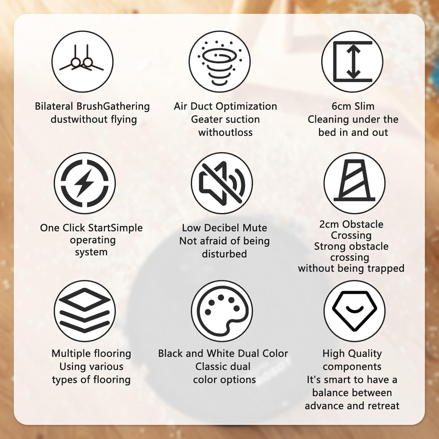 【Wide application】: Use our robot vacuum cleaner to experience the convenience of deep cleaning of dust, hair, cookie crumbs, and more. Suitable for various types of flooring, such as marble, hardwood, ceramic tiles, and wooden surfaces.