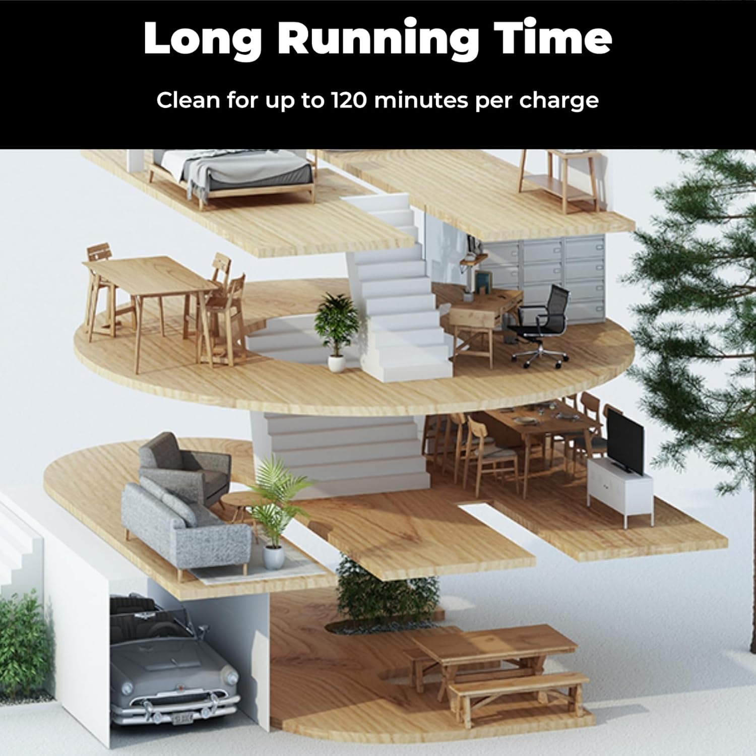 【Long Runtime & Auto Recharge】- Enjoy up to 120 minutes of continuous cleaning across multiple surfaces. When the battery runs low or the job is done, the vacuum automatically returns to its dock to recharge.