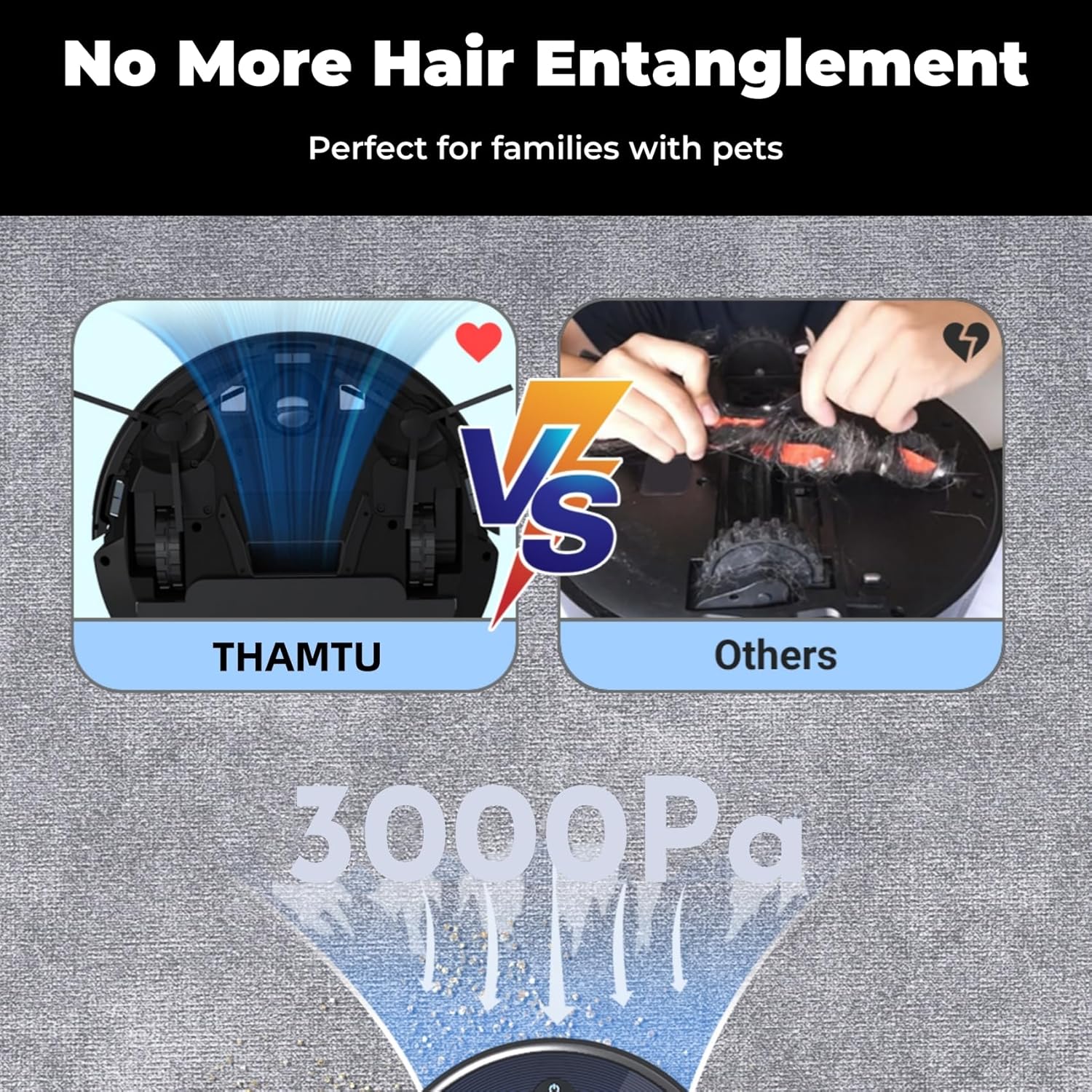 【Powerful 2-in-1 Vacuuming & Mopping】- Equipped with 3000Pa strong suction and a built-in water tank, this robot vacuum efficiently cleans and mops in one go. It easily picks up dust, pet hair, pollen, scraps, and more, while providing a deep mopping finish on hard floors.