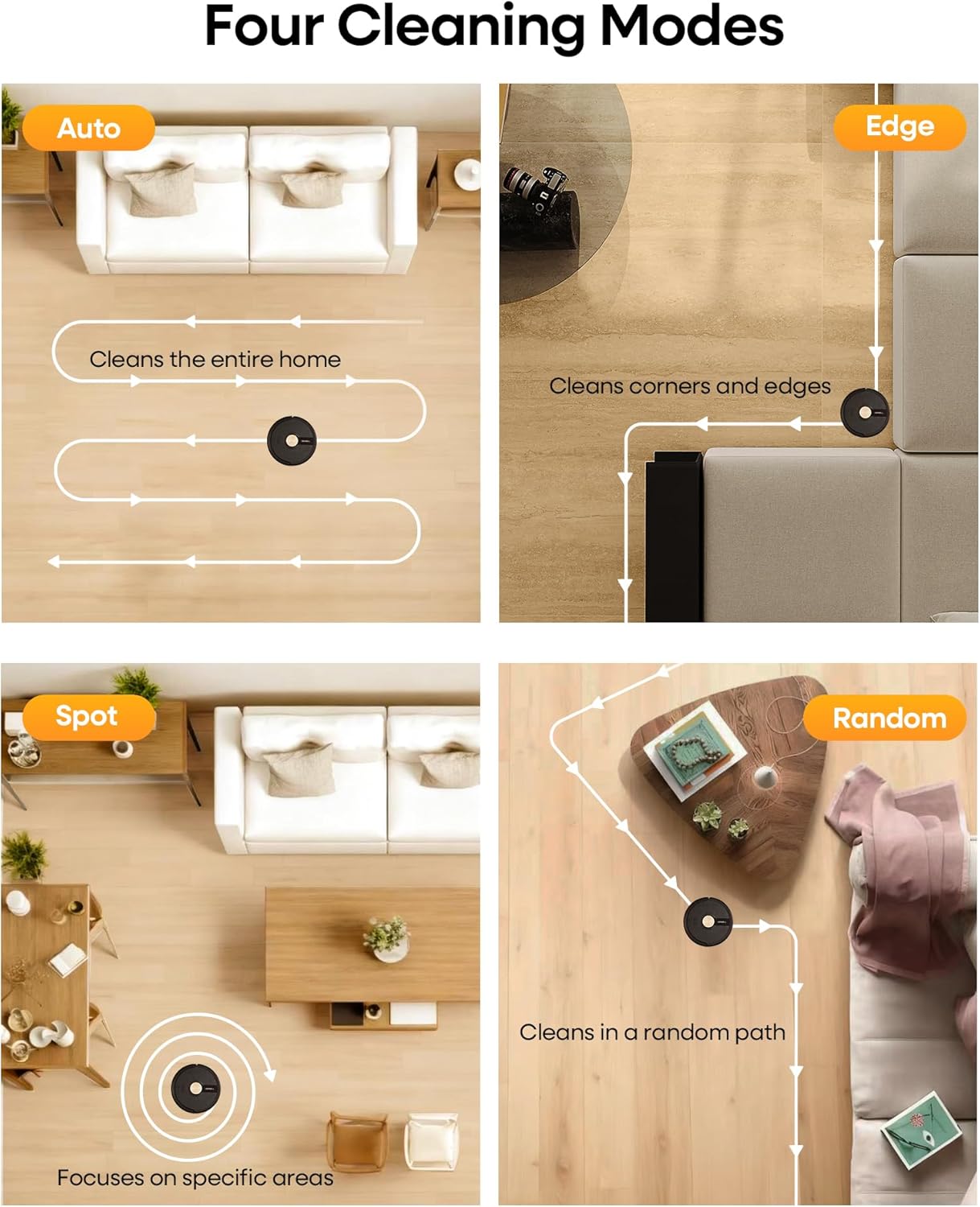 【Gyro-Navigation & Quiet, Comprehensive Cleaning】Efficiently cleans every inch without the noise. Advanced Gyro-Navigation of the robotic vacuums ensures methodical full-home coverage without missing spots. With 4 cleaning modes (Auto, Spot, Edge, Random) and sub-50dB quiet operation, UR1 vacuum robot mop works diligently in the background without disturbing your peace.