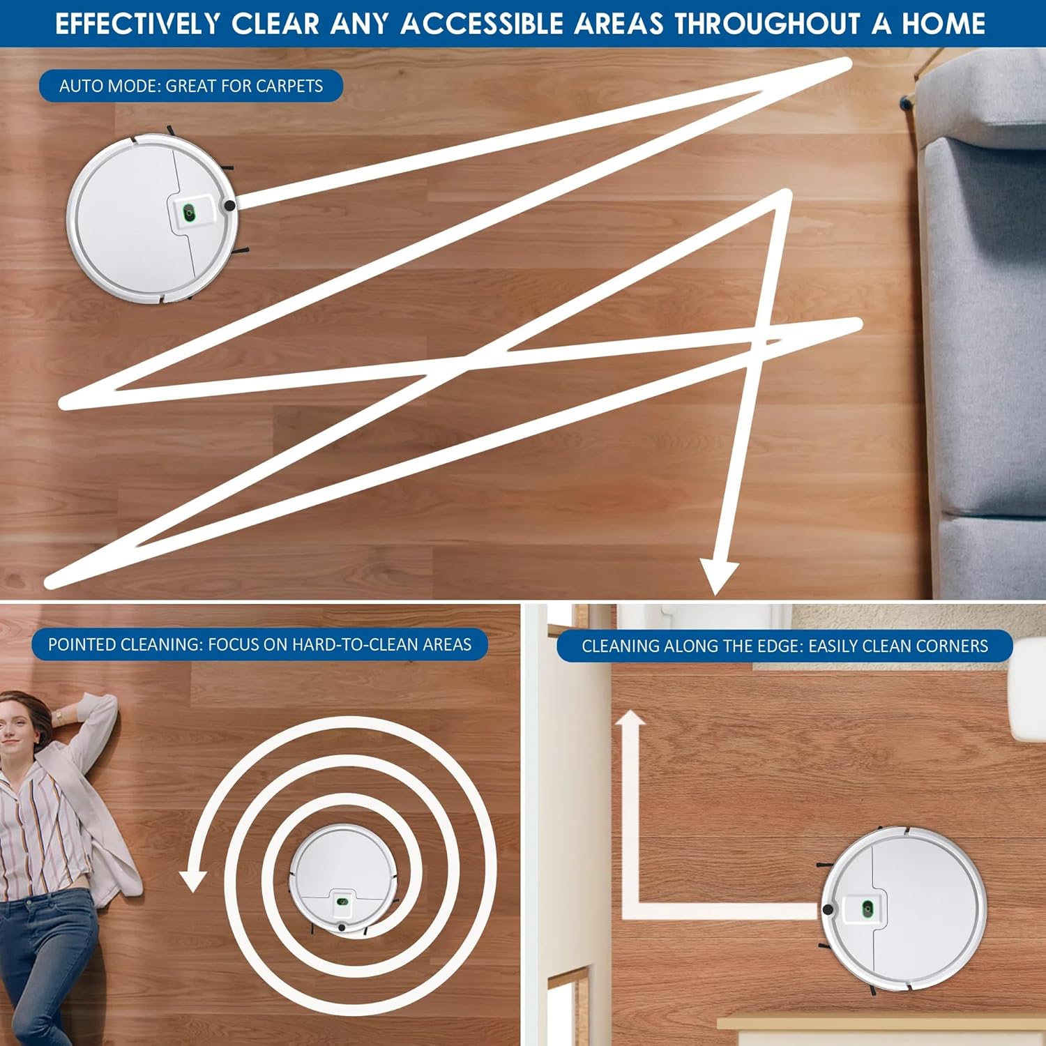 AUTOMATIC VACUUM CLEANER ROBOT, FOR YOUR DAILY HOME CLEAN: The Self-Charging Robotic Vacuum Cleaner supports 4 clean modes including : Auto cleaning,Random cleaning,Edge cleaning,Spot cleaning. built-in anti-collision infrared sensors help the robot vacuum cleaner detect probable stuck areas and adjust the cleaning path automatically.