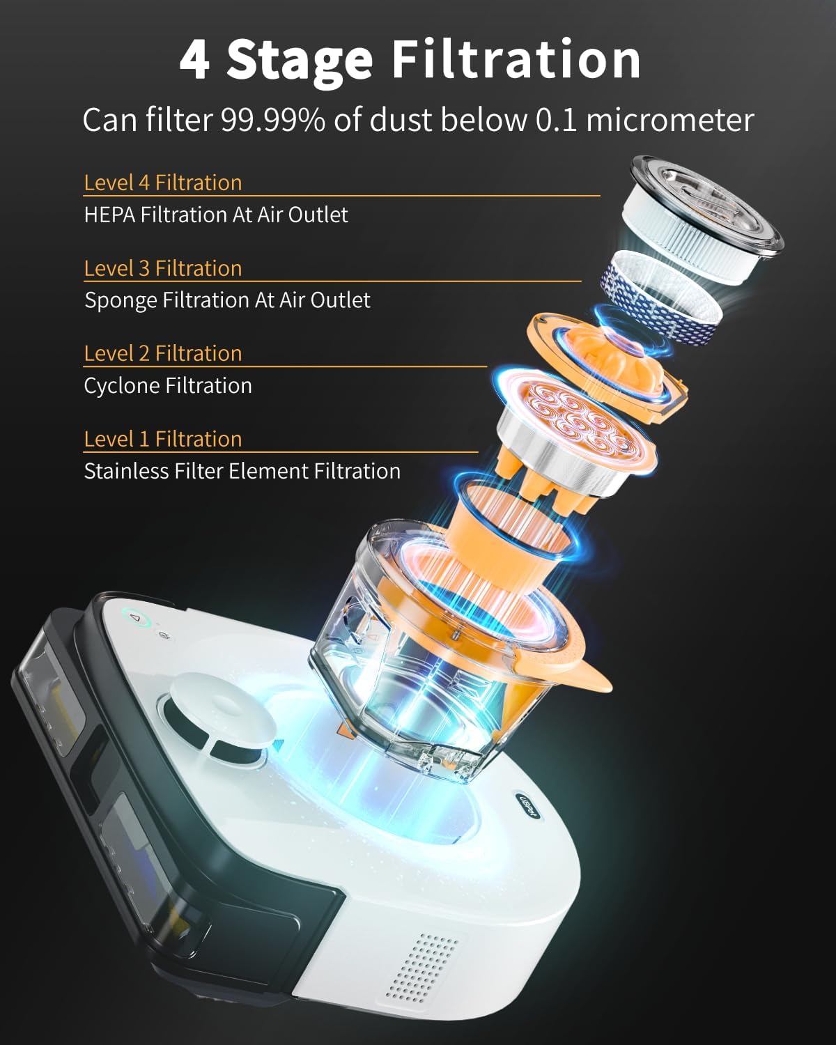 The Robot Vacuum has a powerful suction capability of up to 22,000Pa, with 4 adjustable levels ranging from 9,000 to 22,000Pa.