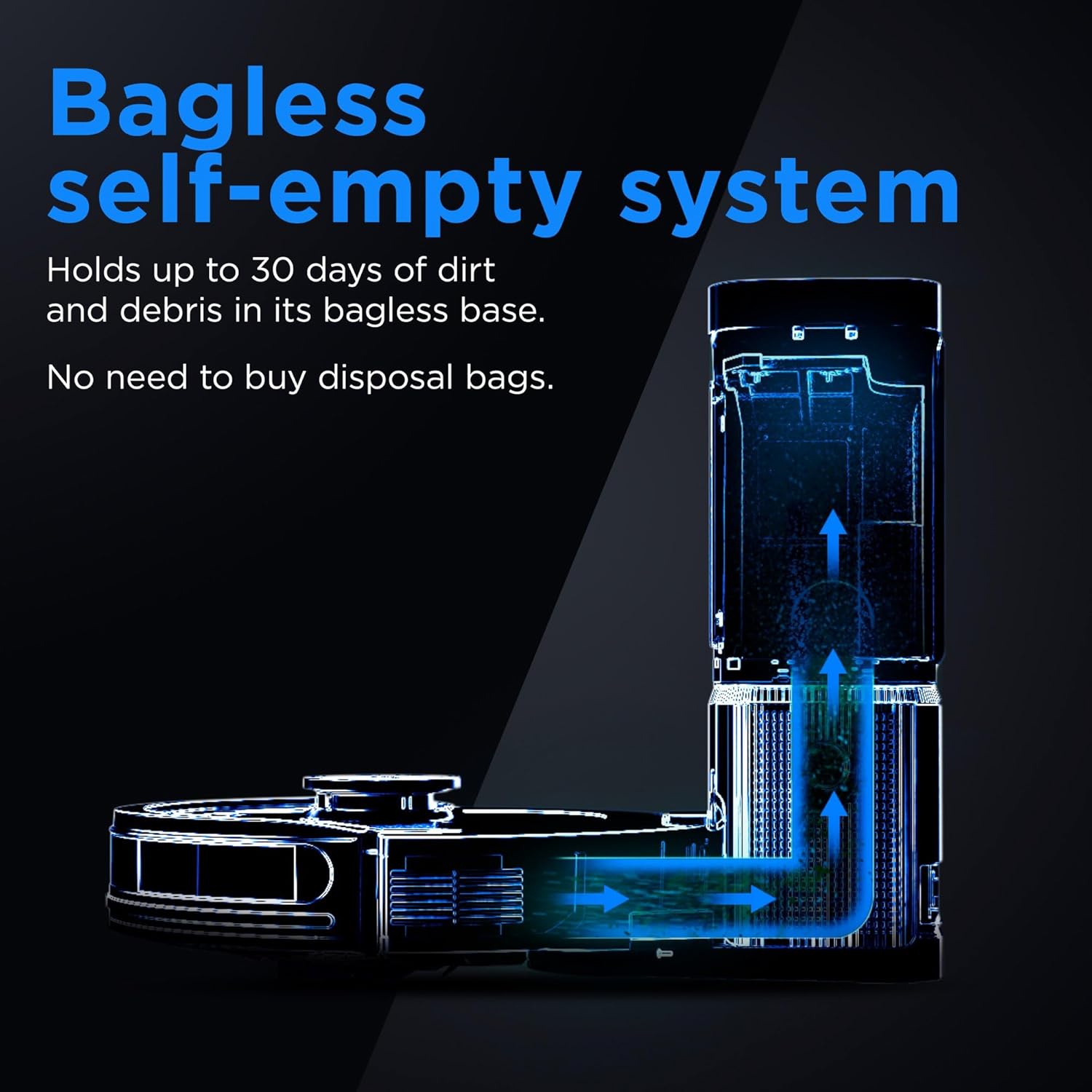 EMPTIES ITSELF: Self-empties after each clean into a bagless base that holds up to 30 days of dirt and debris. The bagless base does not require any additional purchase of disposal bags like traditional auto empty robots.