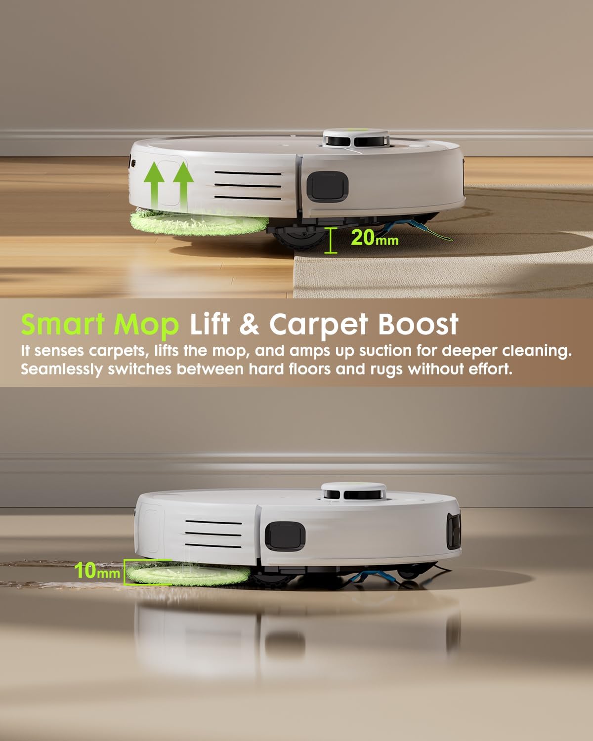 Extreme Suction & Smart Mop Lift – Experience real deep cleaning with 10,000Pa suction power that easily pulls up pet hair, dust, and debris from carpets and hard floors. The V5 PRO robot vacuum and mop can automatically lifts its mop when crossing rugs, keeping carpets dry and floors spotless—perfect for mixed-surface homes.