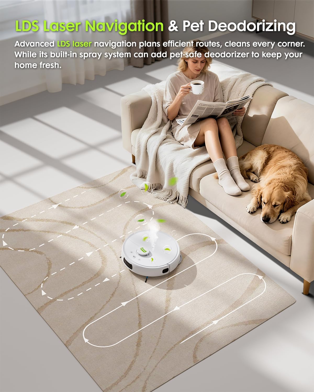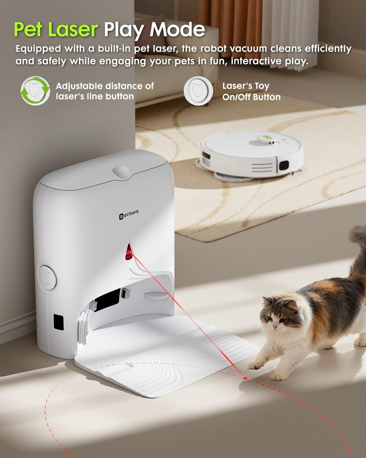 Laser Cat Play Mode & Built-in Deodorizing Spray – Turn chores into playtime. The Laser Cat Play Mode keeps your cat entertained for up to 15 minutes while the robot does its job. When it’s done, the built-in deodorizing spray refreshes your space—add a pet-safe deodorizer or essential oil for a personal touch.