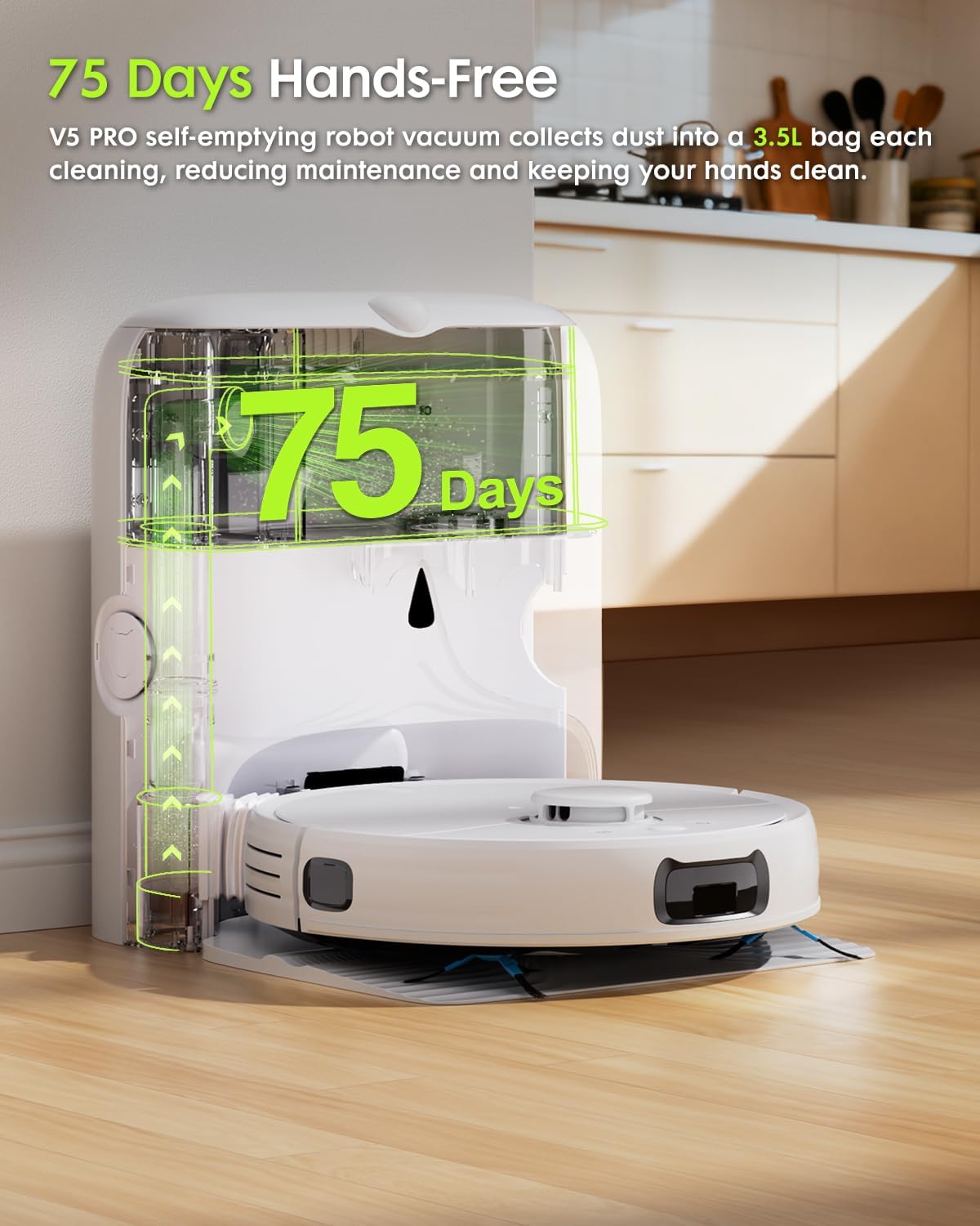 75 Days of Hands-Free Cleaning – Spend less time emptying and more time living. The 3.2L dust bag stores up to 75 days of dirt, while the self-emptying base (25,500Pa suction) automatically clears the bin after every job. The process is quick, clean, and surprisingly quiet—about as loud as a hairdryer.