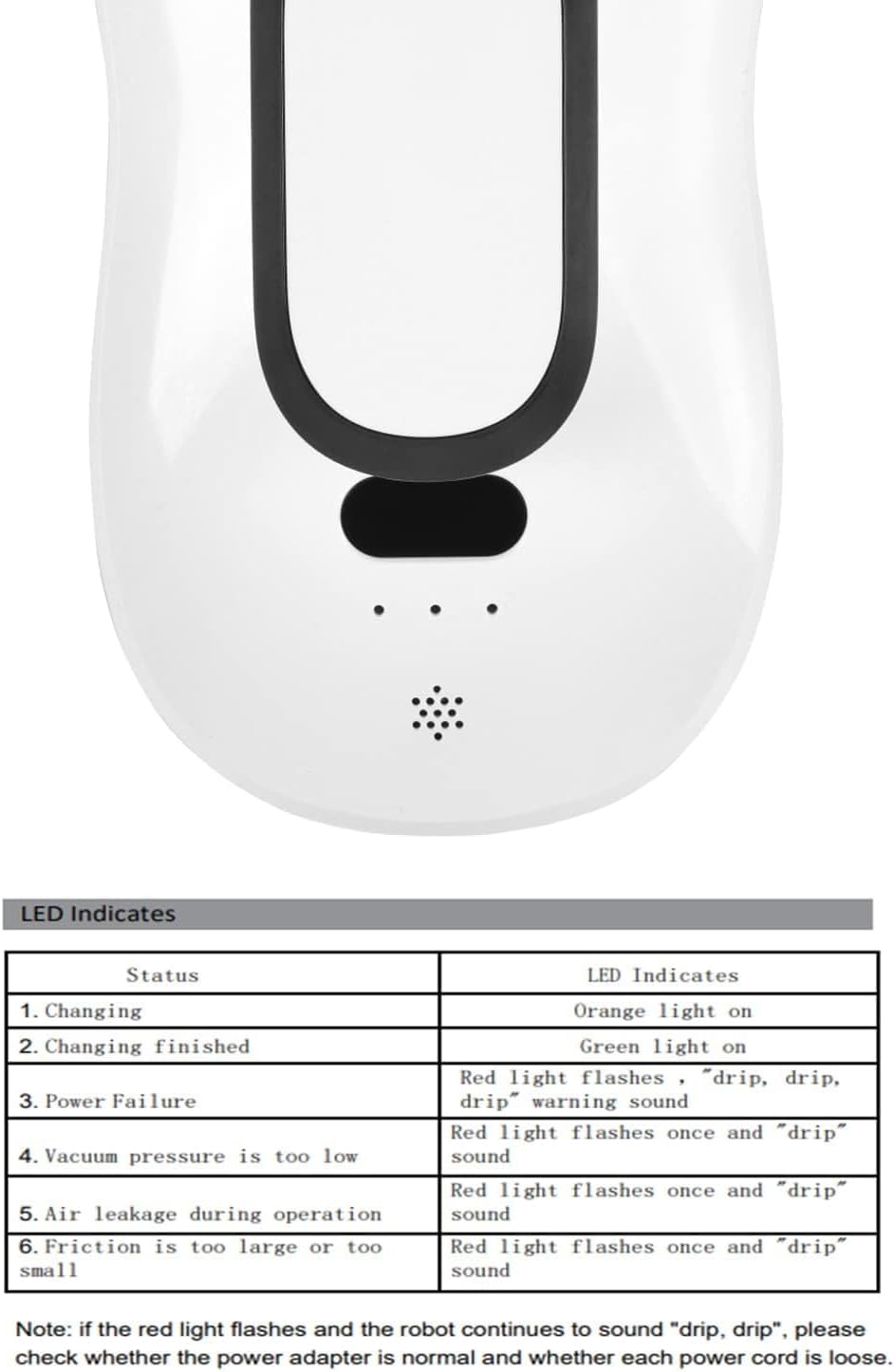 5600Pa super suction power – can make the glass cleaning robot stand firmly on the vertical glass surface (the robot must be connected to the power supply when it is running; the suction power is only effective when charging); the built-in battery provides an extra 20 minutes of backup power when the power is turned off during running time