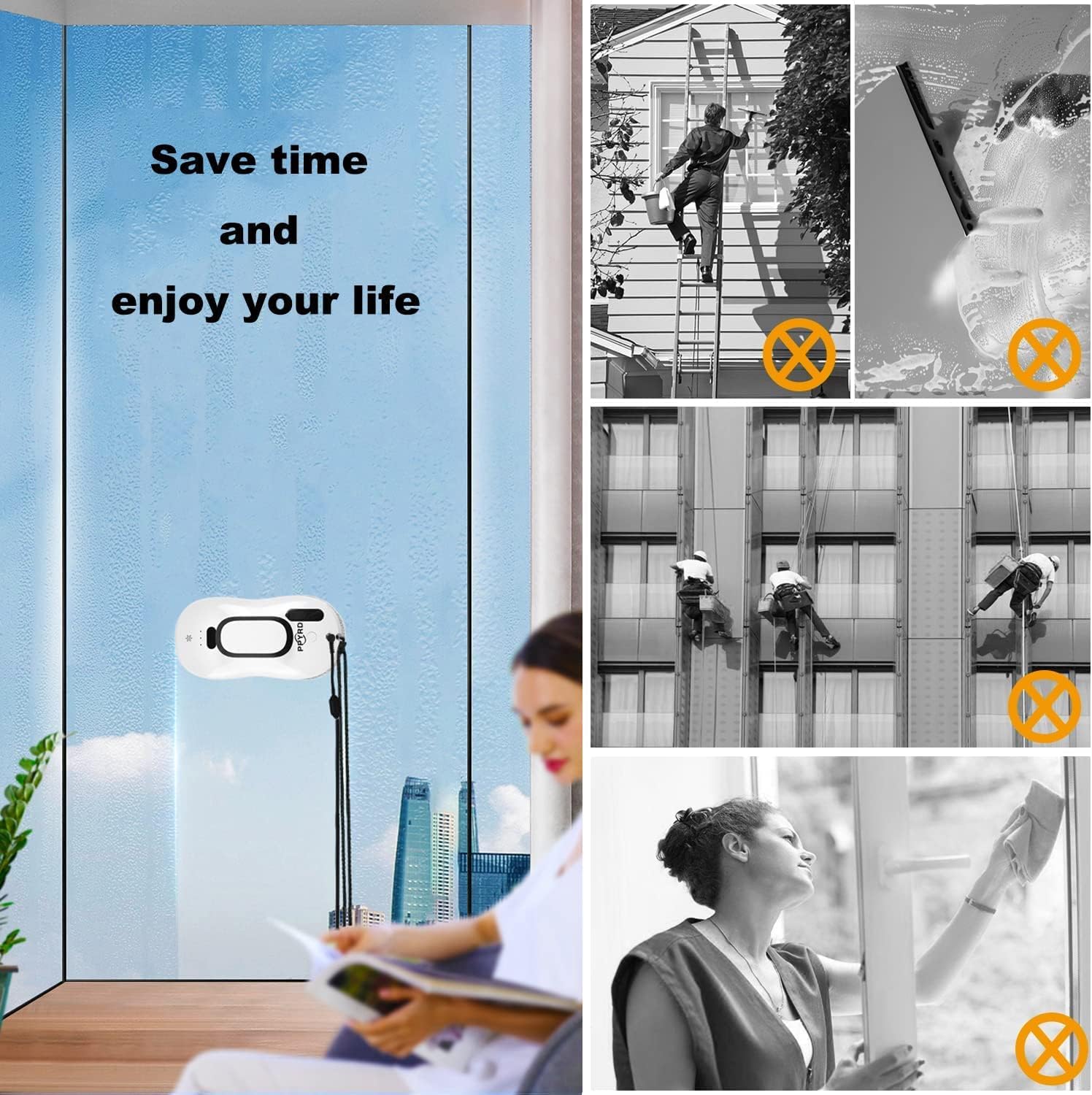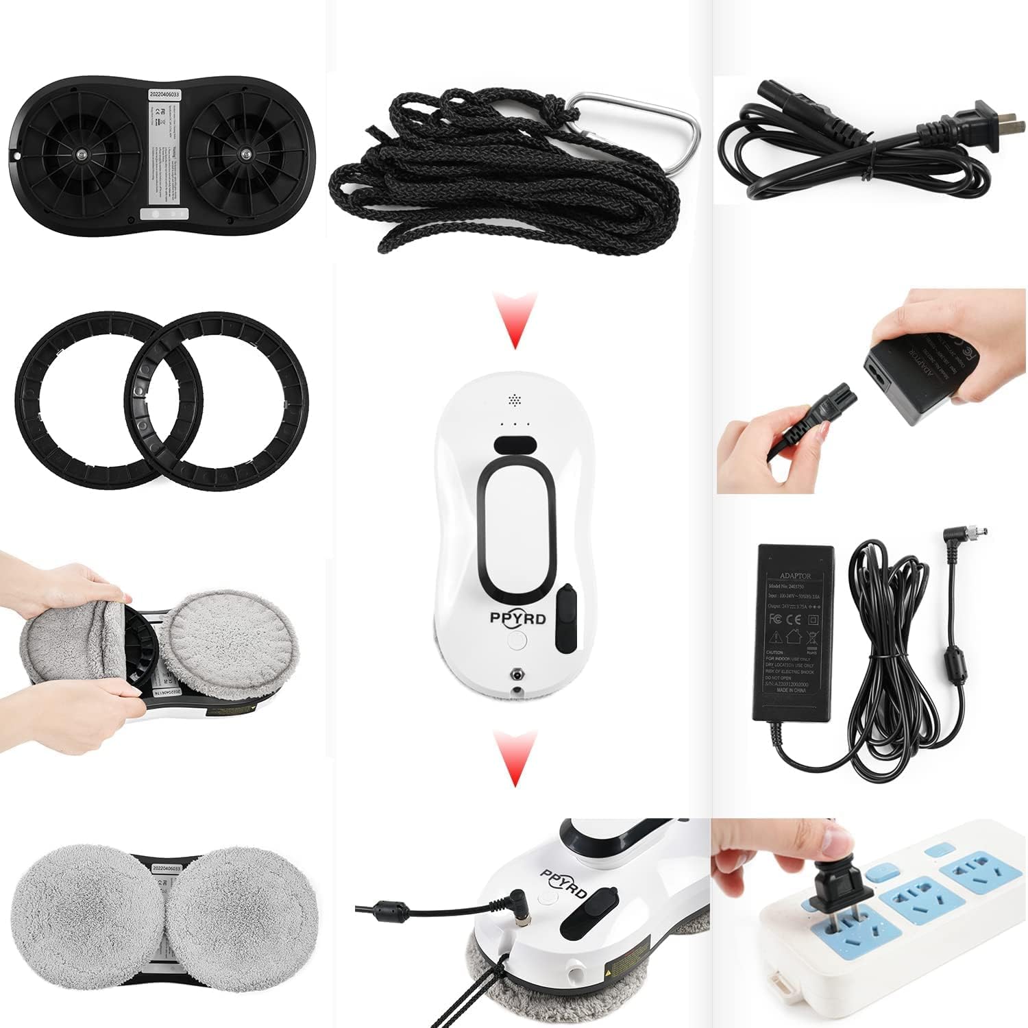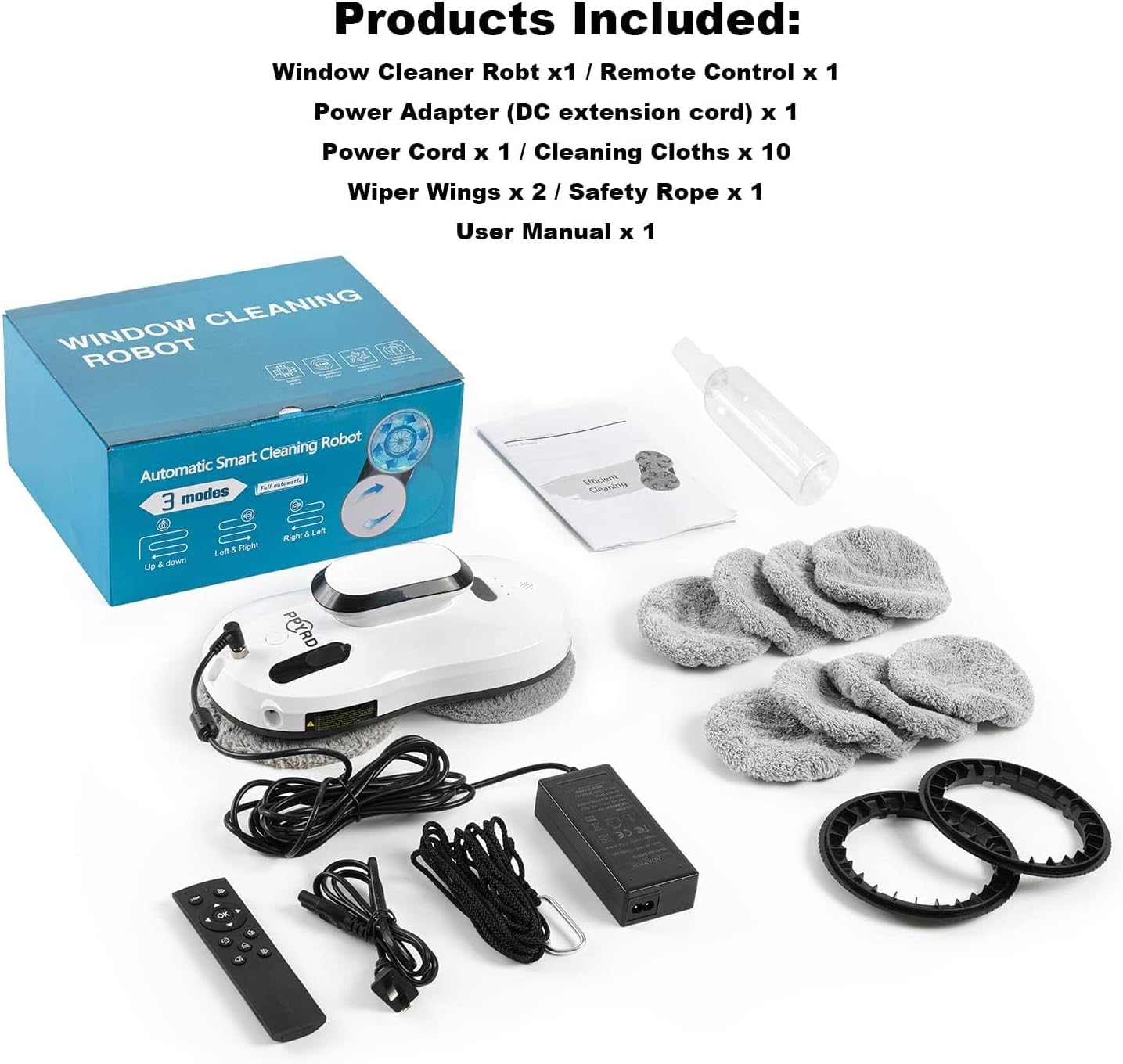 Efficient cleaning – double spiral cleaning head with microfiber cleaning cloth, high-strength safety rope, three automatic cleaning modes or manual control, perfect for cleaning windows (suitable for thickness above 3mm and size over 35*35 cm glass). Please read the operating manual before using. If you have any questions, please contact us.