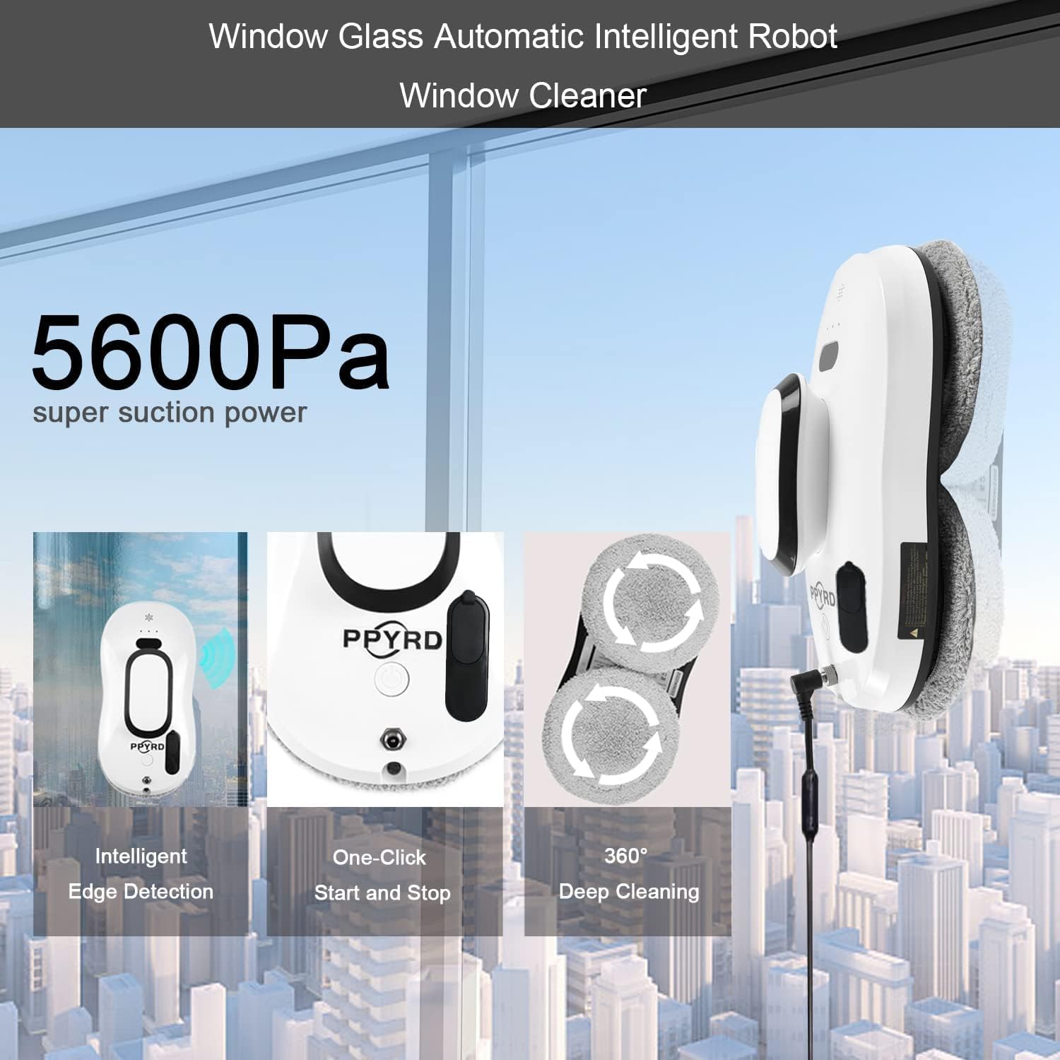 The window cleaning robot uses intelligent AI technology path calculation, and the robot can work on multiple surfaces, such as glass, tiles, smooth walls and tables. A built-in vacuum motor helps the robot inhale and stand on the glass surface. A built-in UPS power supply allows the robot to suck on a window for 20 minutes without direct power.