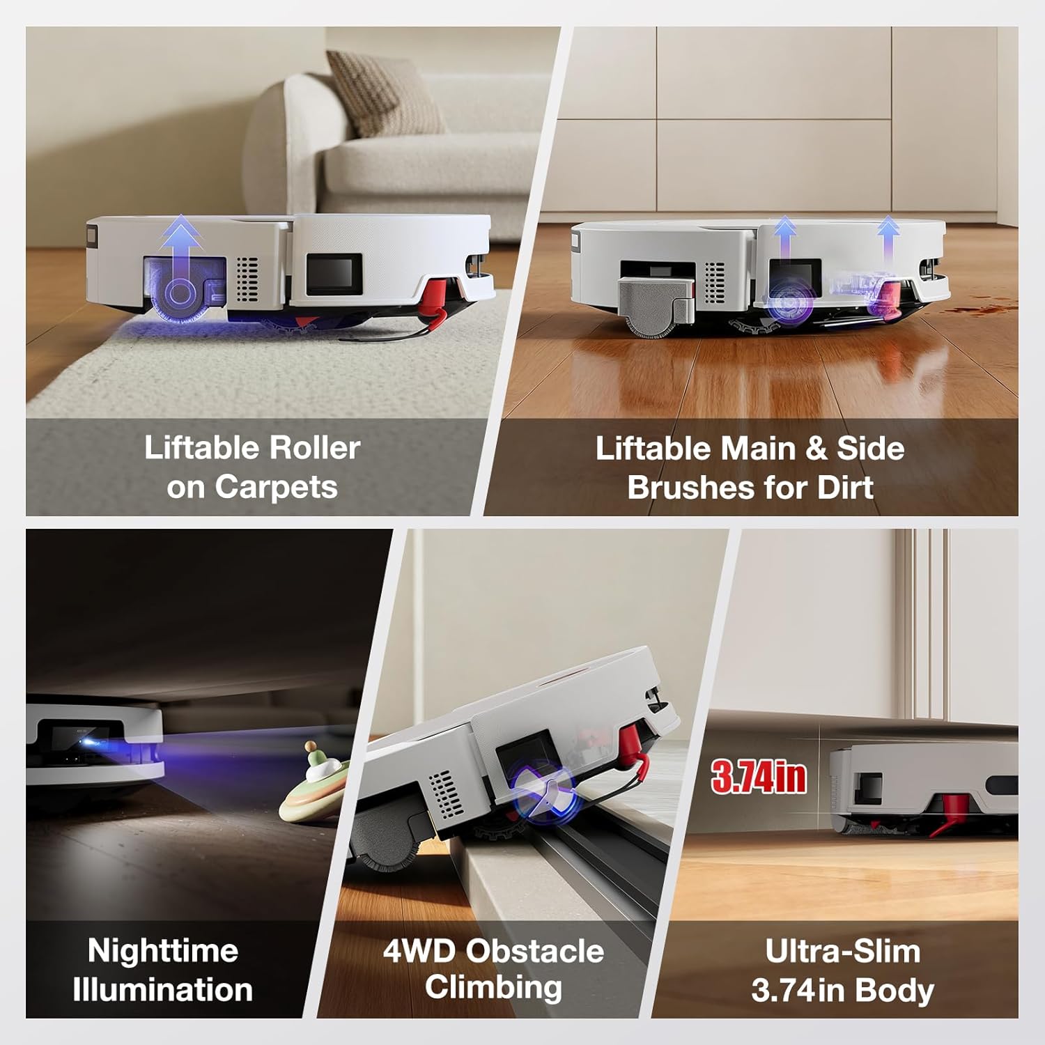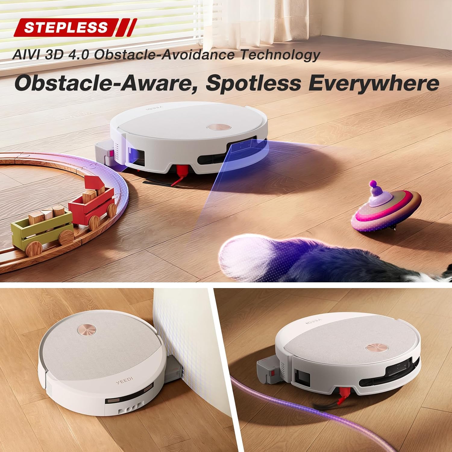 [ADVANCED AI OBSTACLE AVOIDANCE] Equipped with AIVI 3D AI obstacle avoidance system, combined with RGB night fill light, the robot accurately identifies furniture, shoes, pet toys, and other obstacles (even in dark environments), navigating around them without collision or getting stuck.