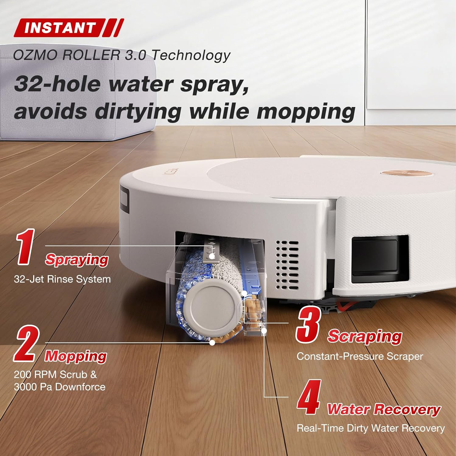 [HOT WATER WASH & HOT AIR DRY] The all-in-one OMNI Station offers smart temperature-controlled warm water mop washing (104°F/131°F/167°F) and 145°F constant hot air drying, keeping the mop fresh and hygienic.