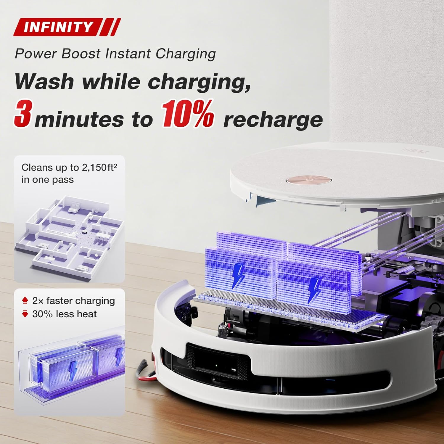 [POWERBOOST INSTANT CHARGING] Boasts extended runtime to cover up to 200㎡ in a single cleaning session; PowerBoost instant charging technology replenishes 10% battery in just 3 minutes, supporting non-stop cleaning for large homes without interruptions.